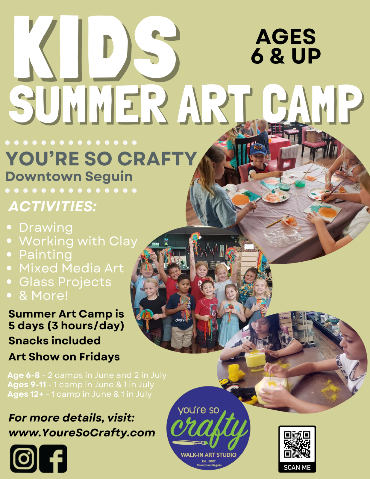 Kids 12+are invited to the 2026 Summer Camp at You're So Crafty. Each day will feature 2 to 4 projects in a variety of media. Projects will include pottery, clay, glass, canvas, mixed media, mosaics, fiber and more, along with Art Journaling.